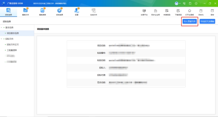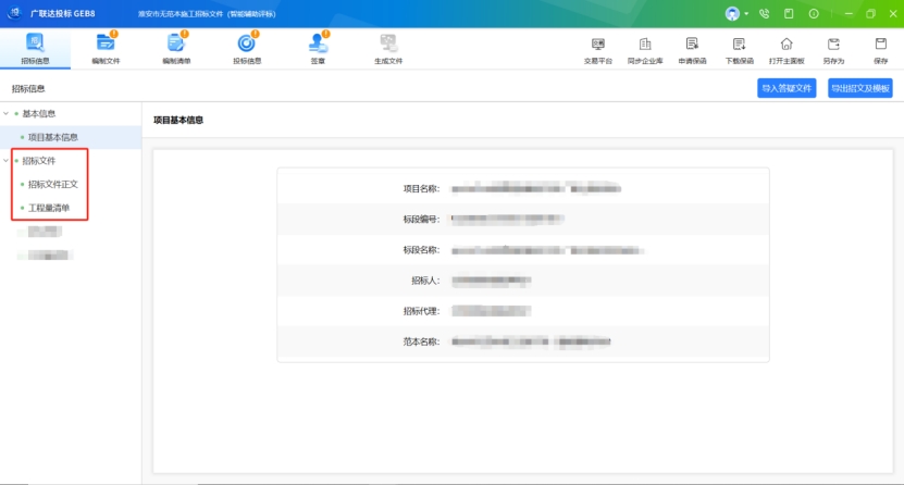 1、招標基本信息:可查看導入的招標文件所對應的項目名稱,標段編號,標段名稱,招標人、招標代理、范本名稱以及評標辦法名稱,快速獲取項目基本信息;