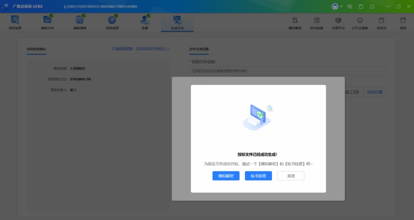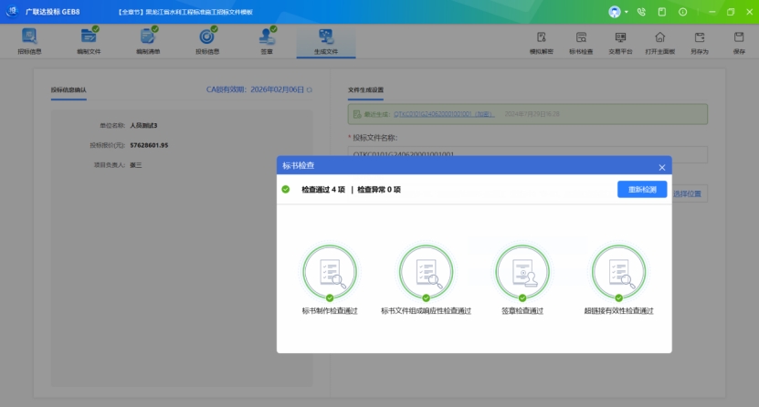 功能描述:針對已生成的投標文件,進行標書檢查,助力開標環境順利解密。