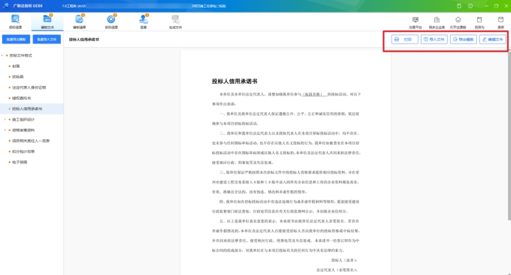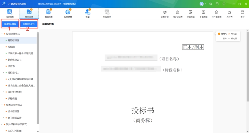 1、編制投標文件,與招標文件中的投標文件格式目錄相同,包含批量導入文件,單次導入導出文件的功能,操作步驟如下: