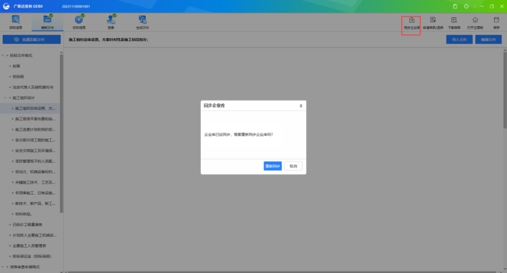 功能描述:同步企業庫是從企業庫中獲取投標企業的信息,同步后企業基本信息及資質業績可直接挑選,不需要在編制的時候再次導入;