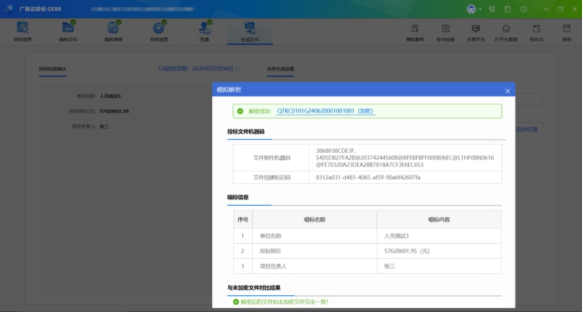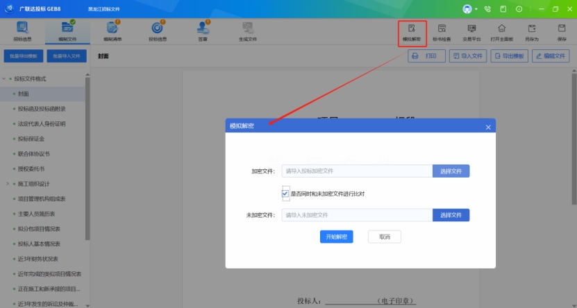 功能描述:針對已生成的加密投標文件,模擬解密,助力開標環境順利解密。