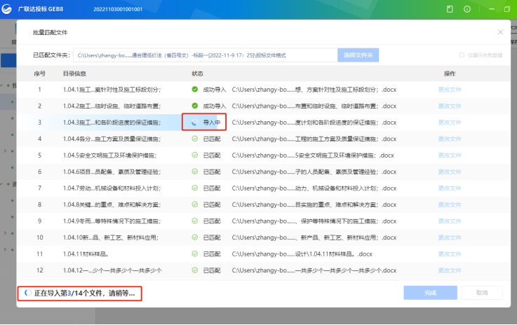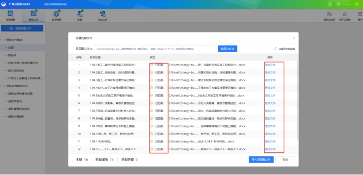 第一步:為方便編制文件,工具提供批量導入的功能,可一鍵導入多節點內容,此功能可配合招標信息生成投標模板一起使用,可大大縮短編制文件時間;