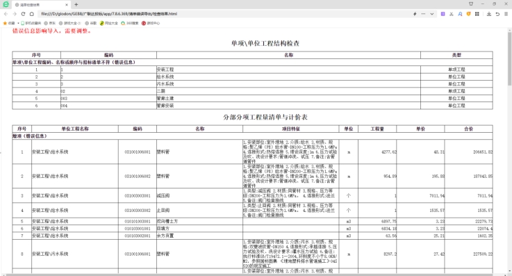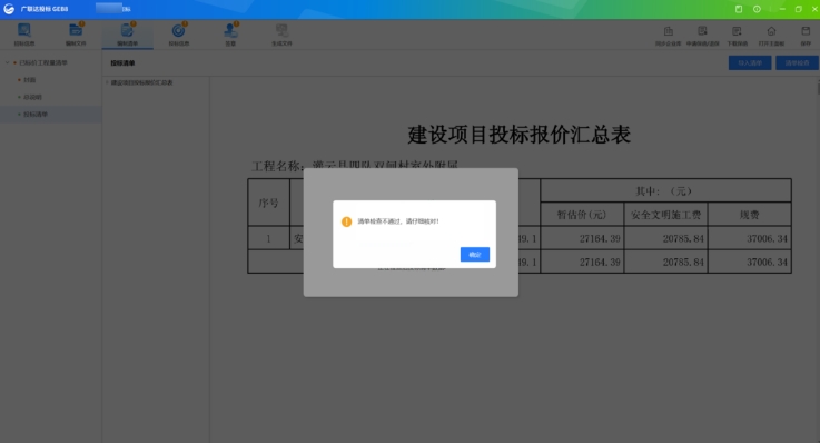 第二步:清單檢查,點擊【清單檢查】,系統將對投標清單進行結構及五統一檢查,檢查通過會提示檢查通過,檢查存在錯誤,可查看錯誤明細,如下圖: