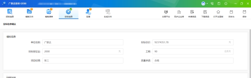 功能描述:投標信息主要用戶填寫招標文件中設置的開標一覽表信息,如已導入清單投標總價、工期等可從清單及投標函中直接帶出