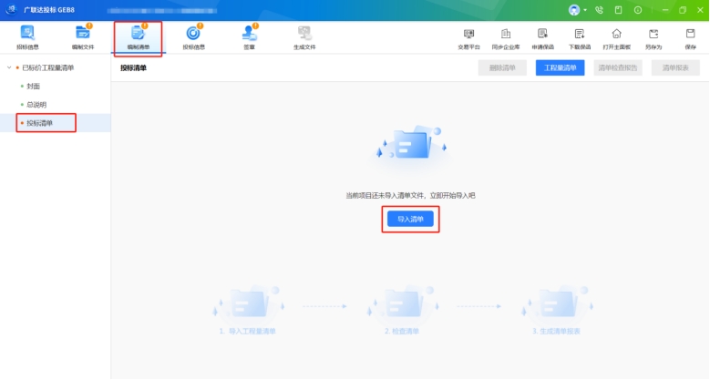 第一步:導入清單,點擊【編制清單】,將廣聯達云計價軟件生成的投標清單(格式為.hljtbx/hgltb/hsltb)導入,如封面有特殊格式要求,手動導入即可。