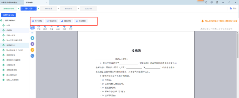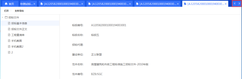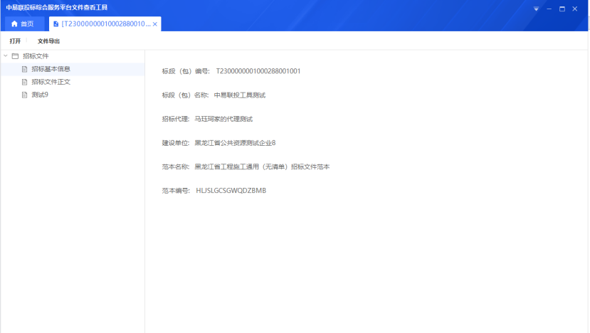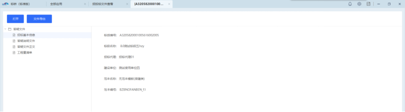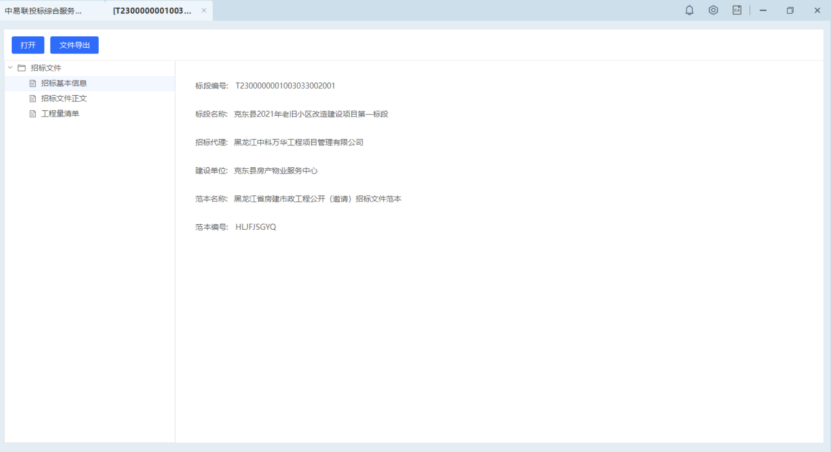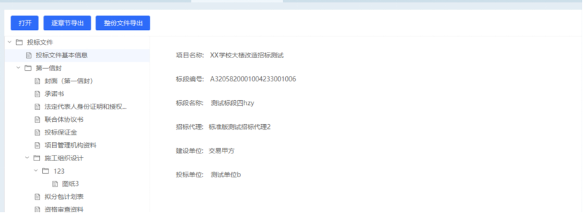 打開投標(biāo)文件后,可以選擇【打開】、【逐章節(jié)導(dǎo)出】、【整份文件導(dǎo)出】。