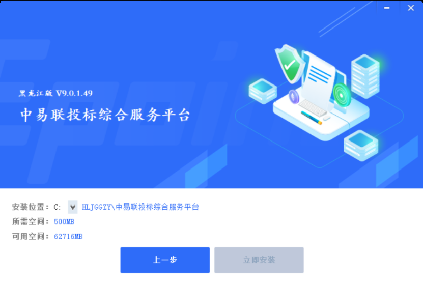 如果不點(diǎn)擊“自定義安裝”,點(diǎn)擊“快速安裝”按鈕,則直接開始安裝,安裝位置默認(rèn)為“c:\HLJGGZY\中易聯(lián)投標(biāo)文件制作工具(黑龍江省版)”。