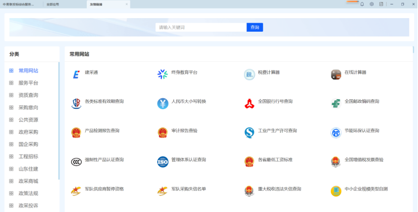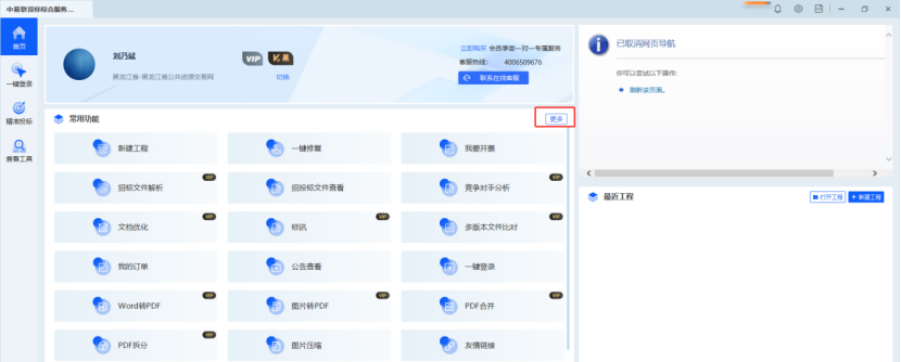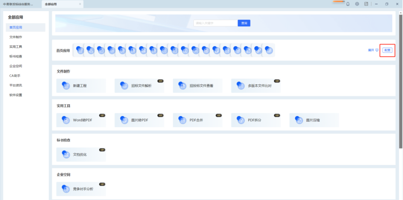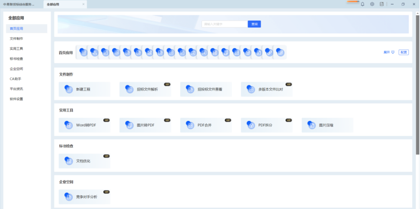 頁面展示所有應(yīng)用,有文件制作、實(shí)用工具、標(biāo)書檢查、企業(yè)空間、CA助手、平臺咨詢、軟件設(shè)置等大類。