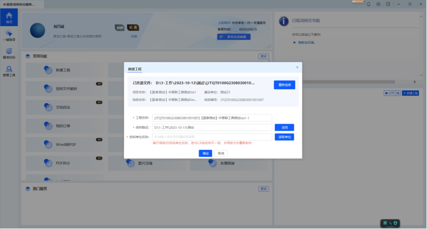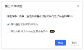點(diǎn)擊【整份文件導(dǎo)出】,非VIP用戶可以選擇導(dǎo)出整份非加密投標(biāo)文件,VIP用戶可以選擇導(dǎo)出本投標(biāo)文件中的誠信庫電子件。