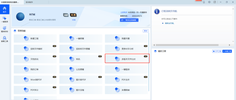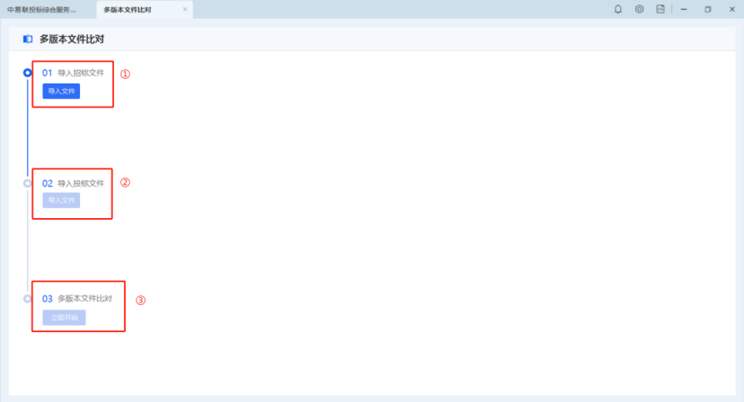 選擇【多版本文件比對】,跳轉(zhuǎn)至多版本文件比對頁面,選擇招標(biāo)文件導(dǎo)入成功后,在選擇對應(yīng)的投標(biāo)文件導(dǎo)入,需要導(dǎo)入至少兩份投標(biāo)文件,點(diǎn)擊【立即開始】,可以對導(dǎo)入的投標(biāo)文件進(jìn)行比對。