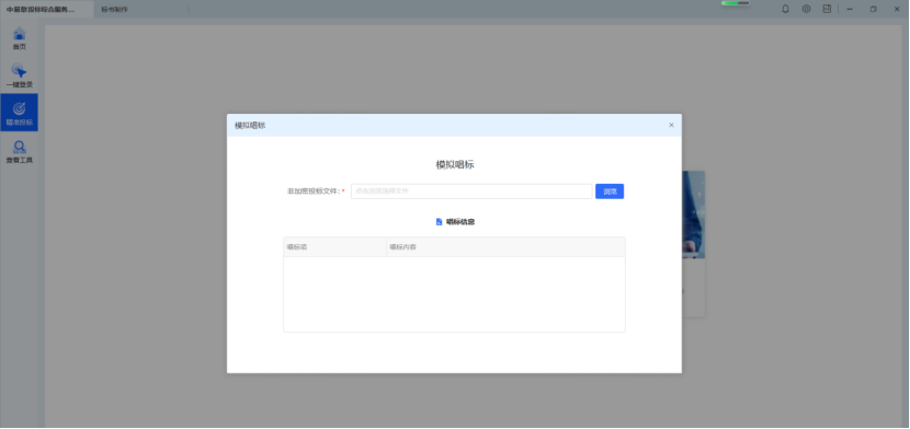 點(diǎn)擊【模擬唱標(biāo)】,在彈出頁面上傳對應(yīng)的非加密投標(biāo)文件,即顯示該文件的唱標(biāo)信息。