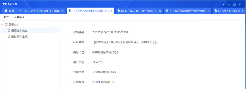 文件頁簽可以查看招標(biāo)/答疑文件的基本信息和招標(biāo)正文、圖紙等內(nèi)容,查看控制價(jià)文件的基本信息和清單等內(nèi)容,查看投標(biāo)文件的基本信息、唱標(biāo)項(xiàng)、投標(biāo)節(jié)點(diǎn)等內(nèi)容。