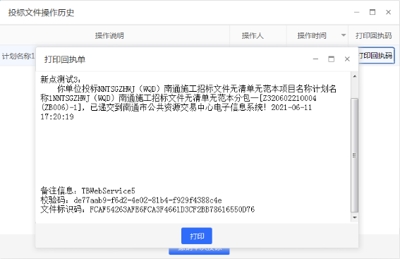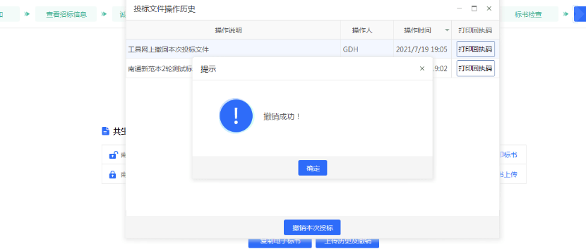 點(diǎn)擊【上傳歷史及撤銷】按鈕,彈出“投標(biāo)文件操作歷史”頁面,可以對上傳的文件進(jìn)行“撤銷本次投標(biāo)”和“打印回執(zhí)碼”的操作。