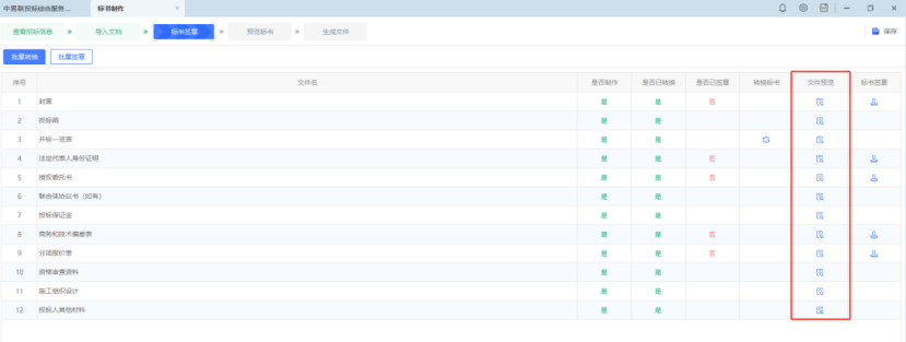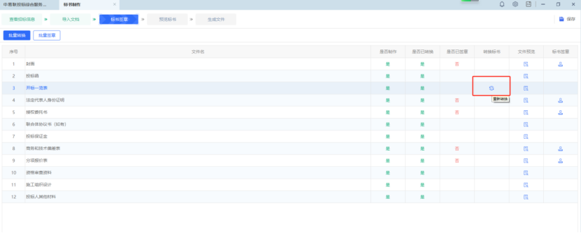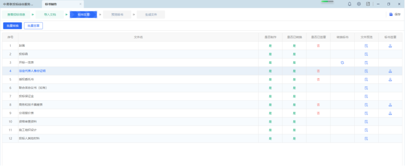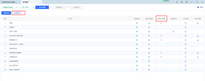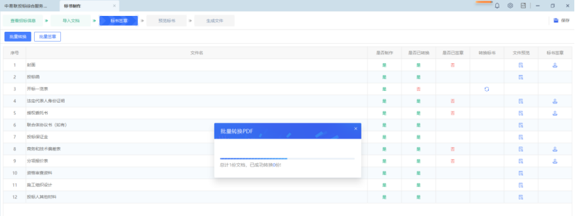 “導(dǎo)入文檔”下所有節(jié)點(diǎn)均已制作完成,點(diǎn)擊“標(biāo)書簽章”進(jìn)入到轉(zhuǎn)換、簽章頁面。點(diǎn)擊【批量轉(zhuǎn)換】,批量轉(zhuǎn)換所有節(jié)點(diǎn)。
