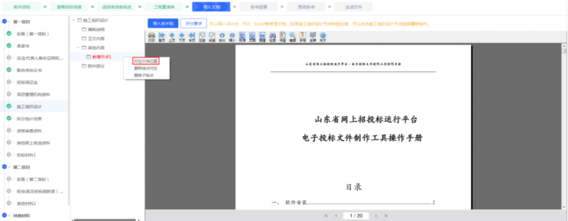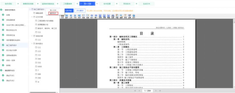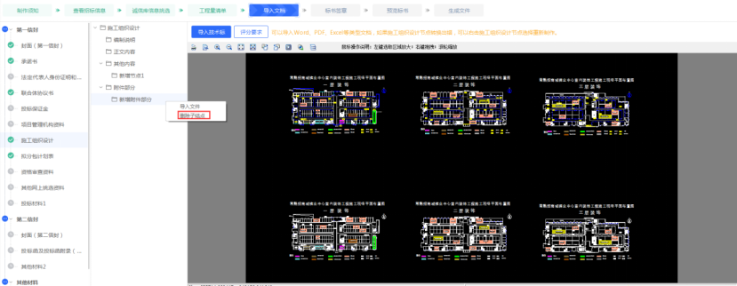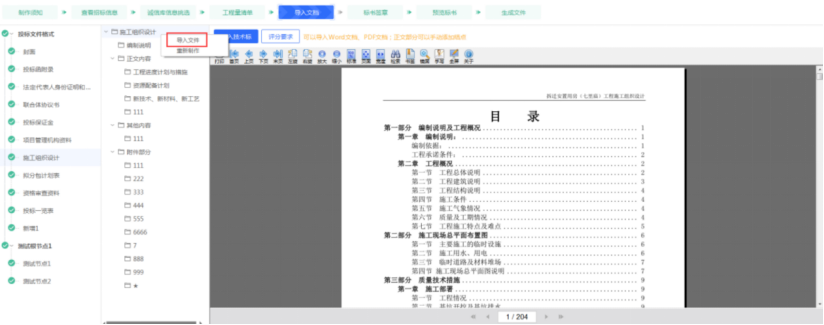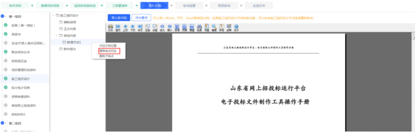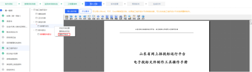 右擊“施工組織設(shè)計(jì)”點(diǎn)擊【重新制作】,清空所有導(dǎo)入的文檔和新增的節(jié)點(diǎn)以及關(guān)聯(lián)。