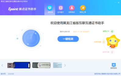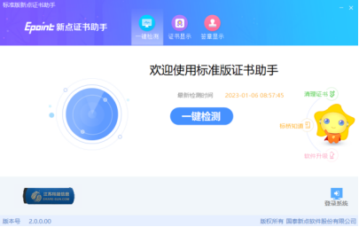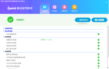 檢測工具是用來檢測客戶環(huán)境里是否安裝了一些必要的控件,檢測您的證書Key是否有效,檢測您的證書Key 能否成功蓋章。用戶可以點(diǎn)擊桌面上的新點(diǎn)檢測工具圖標(biāo)來啟動檢測工具。