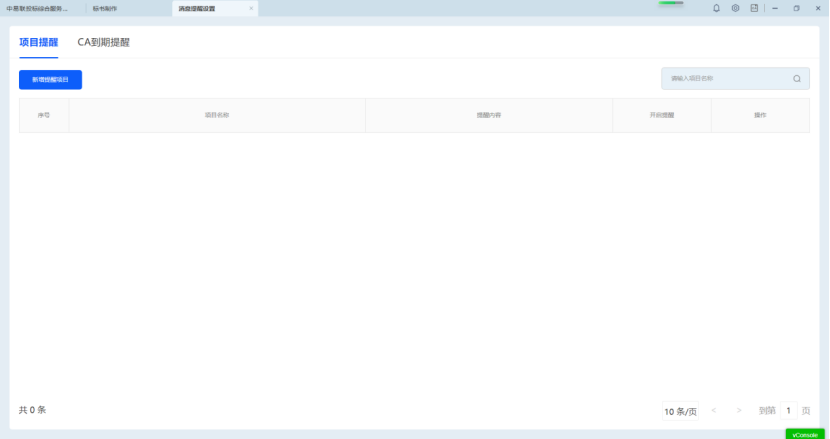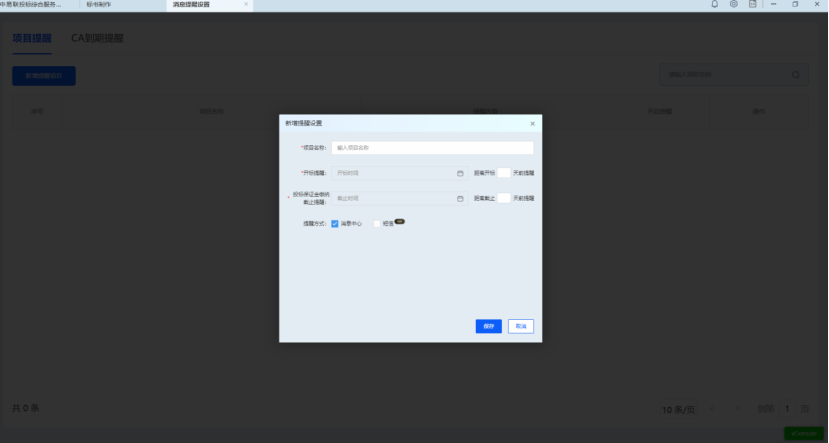 點(diǎn)擊【消息提醒設(shè)置】,可對項(xiàng)目提醒、CA到期提醒進(jìn)行設(shè)置。