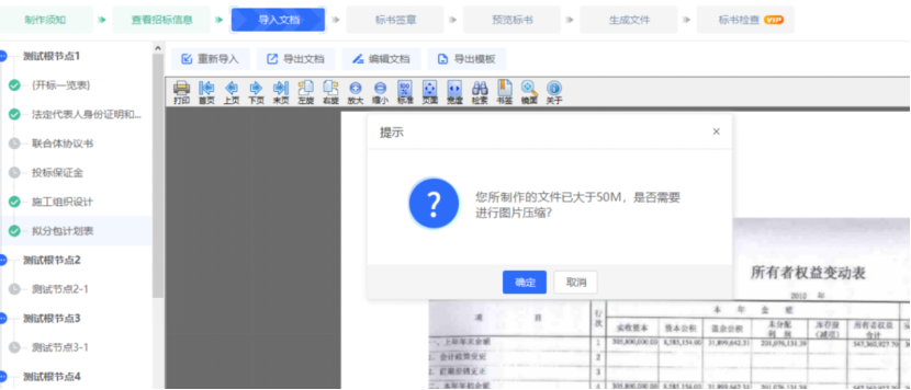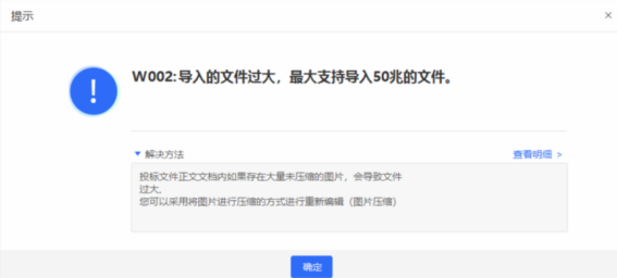 如果導(dǎo)入的word超過50M時(shí),系統(tǒng)會提示是否需要圖片壓縮,選擇【確定】可正常壓縮,壓縮完成后可正常轉(zhuǎn)換;選擇【取消】則提示文件導(dǎo)入過大