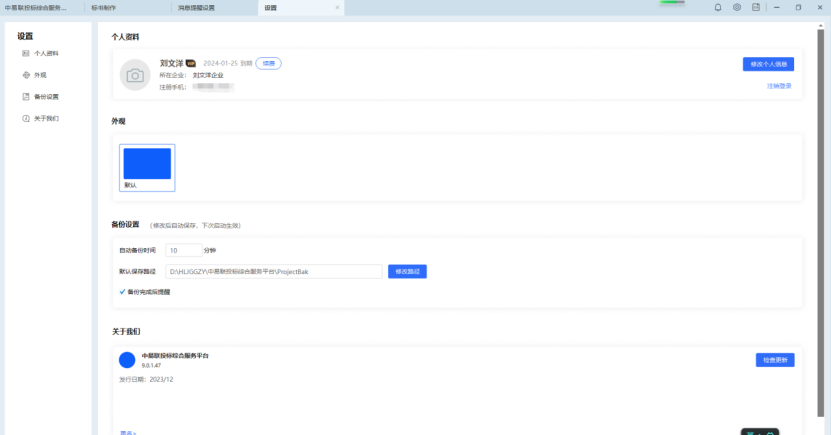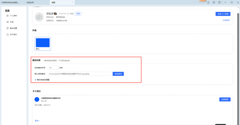 】,跳轉(zhuǎn)至設(shè)置頁面,展示個(gè)人資料、外觀、備份設(shè)置、關(guān)于我們,可修改個(gè)人信息,注銷登錄,更改備份時(shí)間、備份路徑、備份提醒,檢查更新等操作,也可查看我們最近一次的登錄時(shí)間。