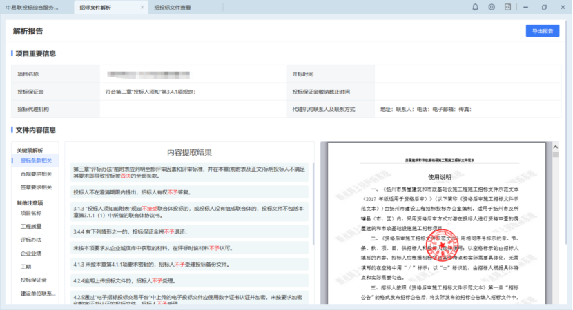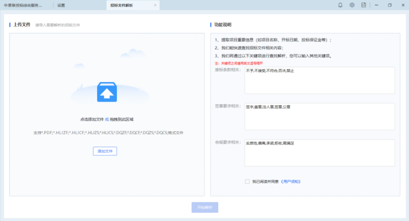 選擇【招標(biāo)文件解析】應(yīng)用,跳轉(zhuǎn)至招標(biāo)文件解析頁面,點(diǎn)擊【添加文件】,分別在廢標(biāo)條款相關(guān)、簽章要求相關(guān)、合規(guī)要求相關(guān)中輸入您所需要檢測的關(guān)鍵字,勾選“我已閱讀并同意《用戶須知》”,點(diǎn)擊【開始解析】,即可對導(dǎo)入的文件進(jìn)行解析。