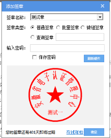 ,在出現(xiàn)的窗口中,選擇簽章的名稱和簽章的模式,并輸入您的證書Key 的密碼,點(diǎn)擊確定按鈕。