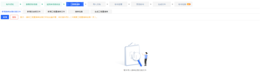 有清單文件有此節(jié)點(diǎn),點(diǎn)擊【工程量清單】,在此界面中有“新增清單封面掃描文件”、“新增總說明文件”、“新增工程量清單文件”、“清單檢查”、“生成工程量清單”五個(gè)頁簽。