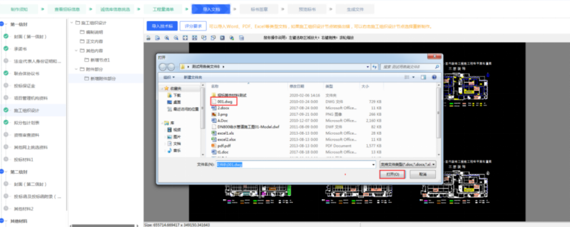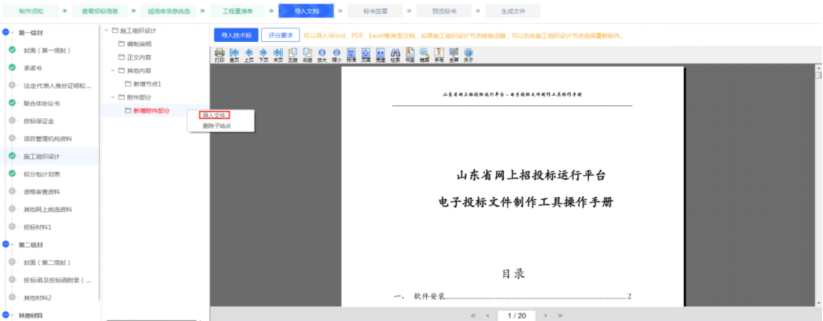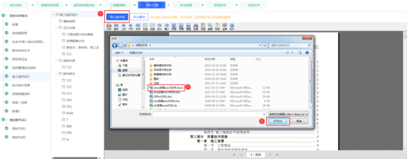 非橫向技術(shù)標(biāo),點(diǎn)擊【導(dǎo)入技術(shù)標(biāo)】,或者右擊“施工組織設(shè)計(jì)”點(diǎn)擊【導(dǎo)入文件】,選擇文件,點(diǎn)擊【打開】,導(dǎo)入文件。