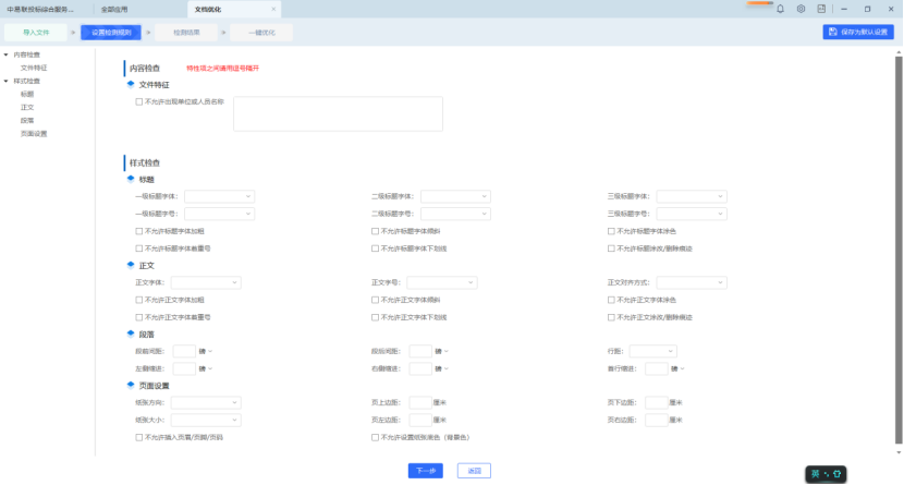 點(diǎn)擊【下一步】,跳轉(zhuǎn)至設(shè)置檢測規(guī)則頁面,針對需要檢查的項(xiàng)設(shè)置對應(yīng)的檢測規(guī)則,設(shè)置完成后可以點(diǎn)擊右上角的【保存為默認(rèn)設(shè)置】。