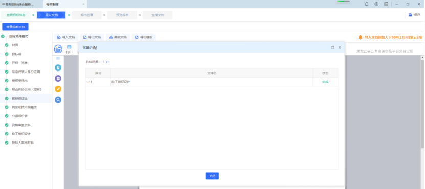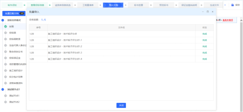 點(diǎn)擊【導(dǎo)入已選中文件】后進(jìn)入批量導(dǎo)入頁面,開始自動為您匹配節(jié)點(diǎn)內(nèi)容,匹配完畢后,可點(diǎn)擊【關(guān)閉】關(guān)閉導(dǎo)入彈窗,對應(yīng)節(jié)點(diǎn)匹配成功