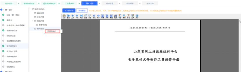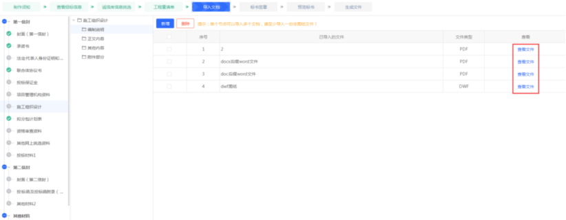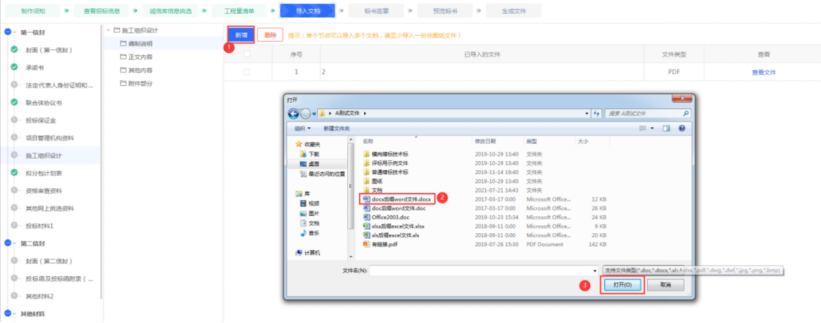 橫向技術(shù)標(biāo),選擇一個(gè)節(jié)點(diǎn),點(diǎn)擊【新增】,選擇文件,點(diǎn)擊【打開】,成功導(dǎo)入文檔,可導(dǎo)入多份。