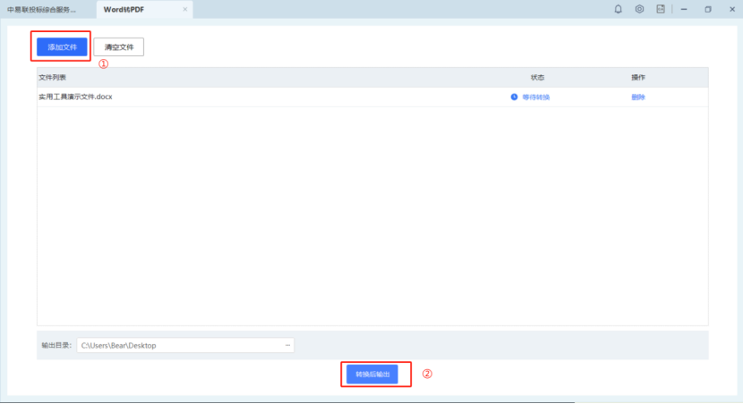 選擇【Word轉(zhuǎn)PDF】,跳轉(zhuǎn)至Word轉(zhuǎn)PDF頁面,點(diǎn)擊【添加文件】,選擇您需要轉(zhuǎn)換的word文檔,可導(dǎo)入多份文檔,點(diǎn)擊【開始轉(zhuǎn)換】,當(dāng)狀態(tài)變成“轉(zhuǎn)換完成”后,點(diǎn)擊【導(dǎo)出】,導(dǎo)出對應(yīng)轉(zhuǎn)換后的文件。