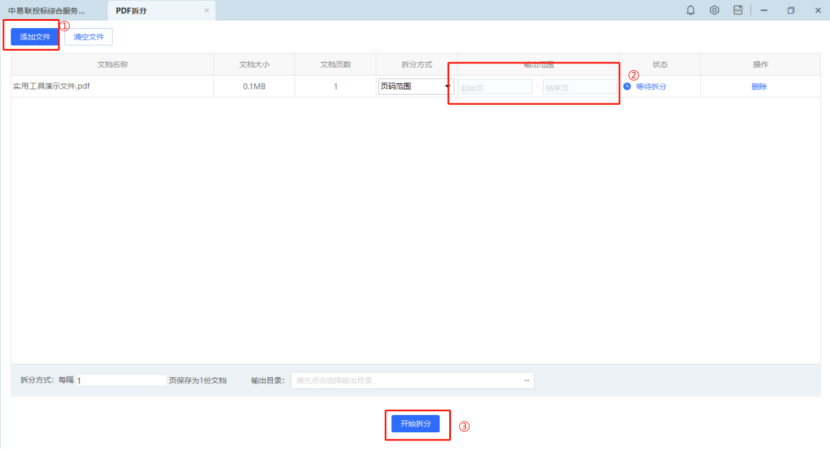 選擇【PDF拆分】,跳轉(zhuǎn)至PDF拆分頁面,點(diǎn)擊【添加文件】,選擇您需要拆分的pdf文檔,輸入輸出范圍默認(rèn)為空或填入正確的范圍,選擇輸出目錄,點(diǎn)擊【開始拆分】,拆分成功。
