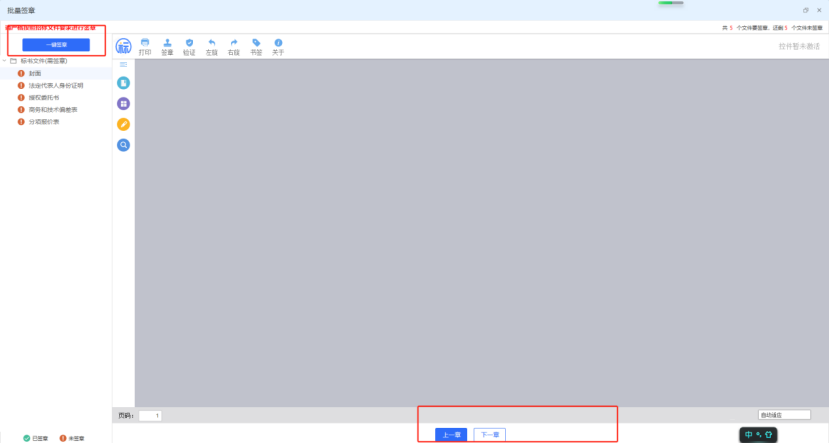 點(diǎn)擊簽章按鈕對文件依次進(jìn)行簽章。可以通過點(diǎn)擊【上一章】【下一章】或者左側(cè)的列表進(jìn)行節(jié)點(diǎn)切換。