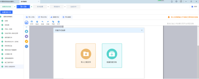 點(diǎn)擊【批量匹配文檔】,彈出彈窗,展示導(dǎo)入工程文件、批量匹配文檔、兩種匹配方式。