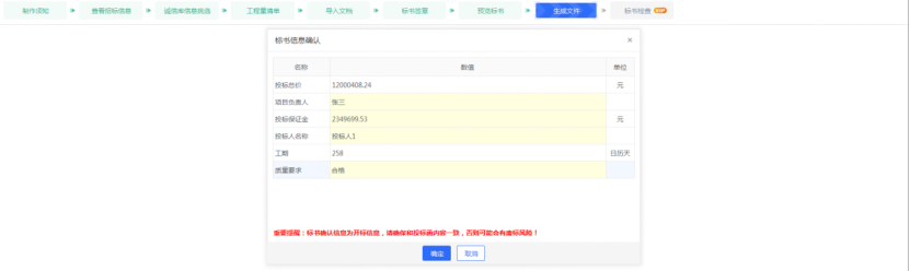 在彈出的標(biāo)書信息確認(rèn)框中確認(rèn)、填寫唱標(biāo)信息,點(diǎn)擊【確定】。
