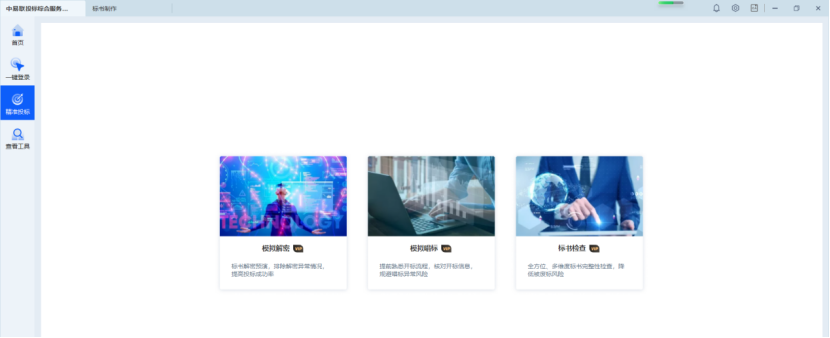 點(diǎn)擊【精準(zhǔn)投標(biāo)】,跳轉(zhuǎn)至精準(zhǔn)投標(biāo)頁面,展示模擬解密、模擬唱標(biāo)、標(biāo)書檢查等功能。