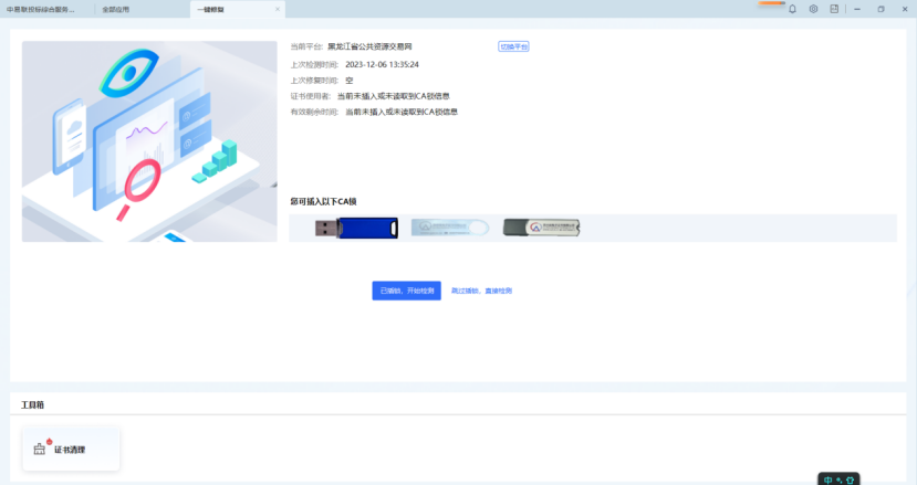 選擇【一鍵修復(fù)】,跳轉(zhuǎn)至一鍵修復(fù)頁面,可以選擇插入CA鎖或不插入CA鎖檢測,檢測成功后可以選擇【重新檢測】或【完成】。