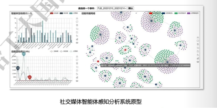 針對當前社交平臺上信息事件態勢發展的碎片化、快速化等特點和社交智能體在信息傳播中扮演越來越重要角色的問題,本研究團隊研制了一套信息感知與智能體傳播分析系統,挖掘了網絡信息事件發展中熱門信息的傳播脈絡,呈現了信息事件中的熱門討論社區,實現了對社交平臺智能體的挖掘分析,進一步計算分析社交智能體集群在信息事件發展傳播過程的具體作用和影響。