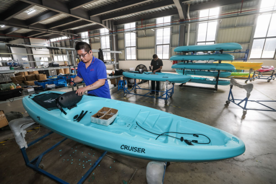 6月25日,在位于慈溪市的浙江酷爾智能科技有限公司的車間內(nèi),工人在加工出口的皮劃艇。新華社記者 徐昱 攝