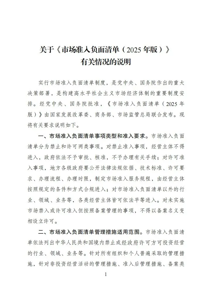 《市場準入負面清單(2025年版)》已經(jīng)黨中央、國務(wù)院批準,自即日起印發(fā)實施,請結(jié)合實際認真貫徹落實。2022年3月12日發(fā)布的《市場準入負面清單(2022年版)》(發(fā)改體改規(guī)〔2022〕397號)同時廢止。